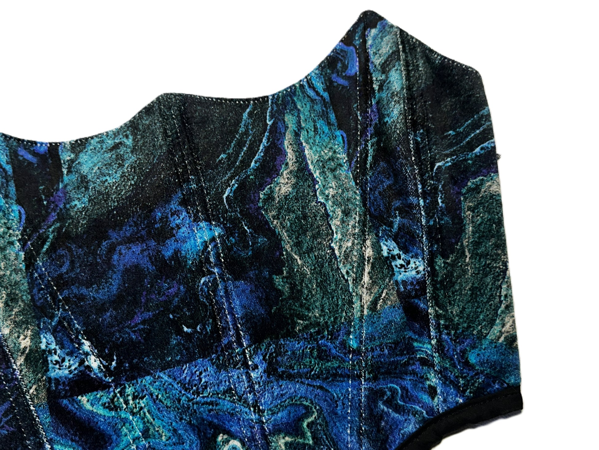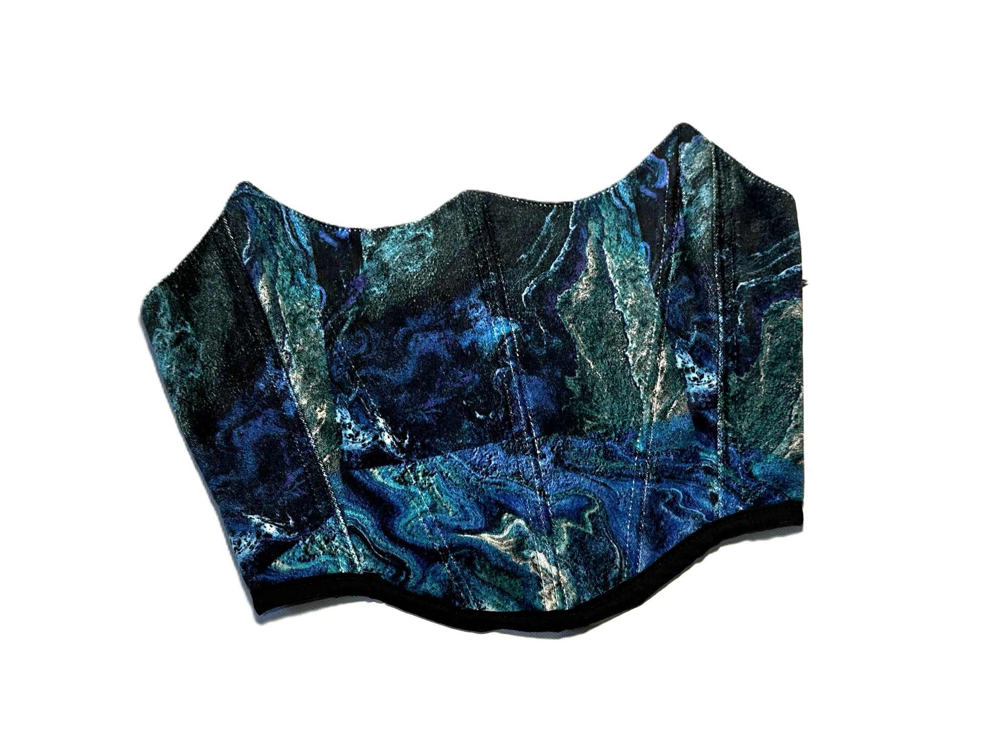 Dieses trägerlose Korsett besteht aus einem marmorierten Samtstoff aus Polyestermischung in verschiedenen Blautönen. Die changierende Oberfläche verleiht dem Stück Tiefe und Bewegung.