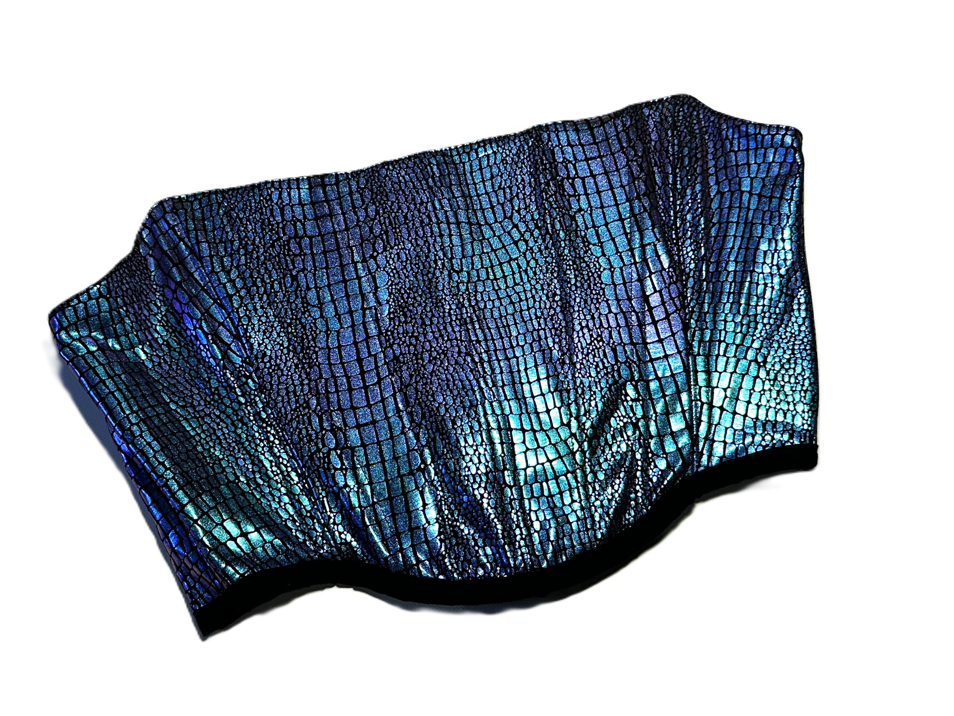 Dieses wendbare Korsett ist ein Einzelstück, gefertigt aus einem upgecycelten Kleid mit schimmernder Schlangenoptik in Schwarz, Lila und Blau. Das Material aus Polyester reflektiert das Licht und macht das Korsett zu einem echten Blickfang.